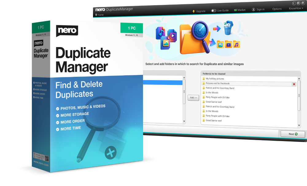 So einfach gehtsWählen Sie einfach einen oder mehrere Ordner oder Laufwerke aus. Nero DuplicateManager zeigt nach einem kurzen Scan, was Sie aufbewahren sollten und was sicher gelöscht werden kann.